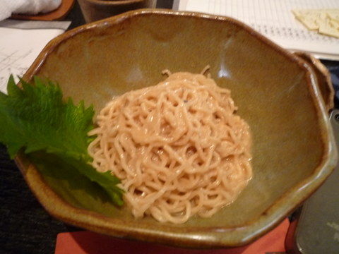 自家製麺の烏龍麺です。仕込み水に烏龍茶を使っているとのこと。よくすったごまだれスープが絡めてありました。おいし~。
