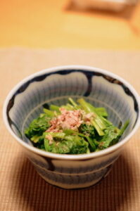 八方だしを作り、菊と小松菜のおひたしに使ってみました。食べてみると、香りとうまみが口中に広がり、みずみずしい食感でやめられない止まらない状態になりました。