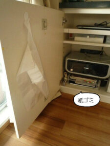 位置は、キッチンのすぐ隣のマルチカウンターの中です。この扉を開けると、紙ゴミのトレーがありますので、ここからクズ紙を1枚取って袋の底に敷いて汁受けにしてます。だからこの位置がいいのです(^^)