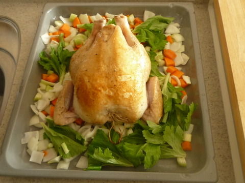 さて、ロースト・チキンは、まず1週間前にお肉屋さんに丸鶏の予約をしたほうが無難です。形を整えるためにチキン針で足を体にくっつけるように縫います。オーブン天板に2cm角のミルポワを敷き詰め、フライパンで焼き色を付けた鶏をのせてオーブンに入れます。ミルポワはにんじん、セロリ、玉ねぎです。