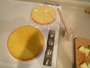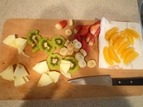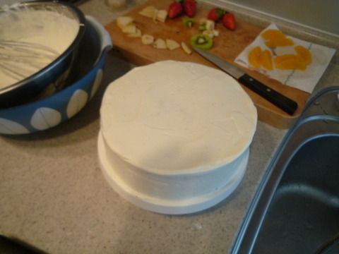 ケーキに使う果物は当日に切るしかありません。意外に時間がかかりました。バナナは褐変しやすいのでレモン汁をふりかけた方がよいです(今回、サボって後で悲しい事になりました)。