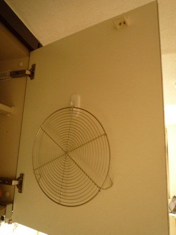 ひとつは、ケーキクーラー用です。オーブンに一番近い吊り戸棚の扉に設置しました。これまではケーキクーラーを吊り戸棚の中に立ててしまっていましたが、円形なので転がり落ちてくる事があって危ないな~と思っていました。吊り下げたのですごく取り出しやすくしまいやすくなり、便利になりました。