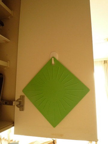 もうひとつは、鍋敷き兼オープナーです。シリコン製なのでクニャクニャしていてしまいにくかったのですが、このようにつるす事できれいにしまえるようになりました。