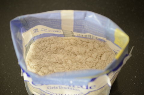 中に入っている塩は、ゲランドのセル・マリン・ムリュ(またはセル・ファン)という、細粒塩を使っています。いつもらでぃっしゅぼーやで注文していますが、カルディや成城石井でも売られています^^