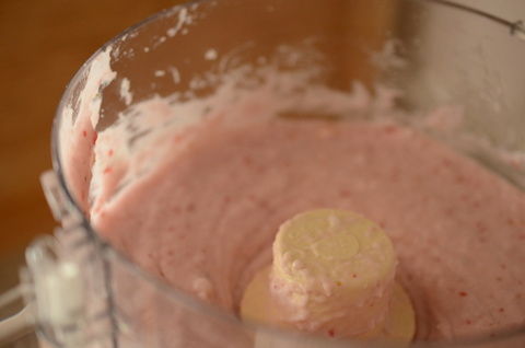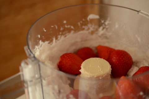 そこへいちごを加えてガーッとまぜます。ここで砂糖も加えます。