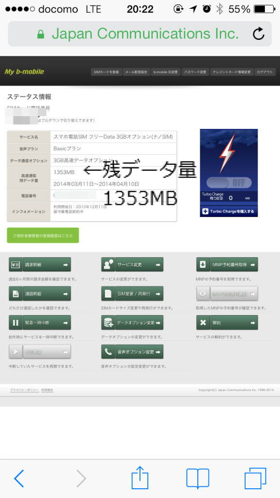 私が利用しているのはb-mobileのスマホ電話SIM フリーData 3GBオプション(ナノSIM)というもので、実際の回線はドコモです。