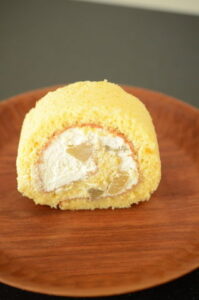 備蓄のミックスフルーツ缶詰が賞味期限間近になったため、食べてしまおうと、ロールケーキの中に入れて食べました。