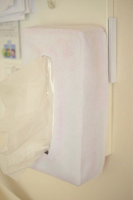 ティッシュをマグネットで固定するものを100円ショップで買ってきて、マグネットボードに固定し、上からすっぽりとカバーをかけました。