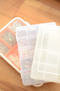 箱いっぱいにあふれかえっていた金具類をきれいに収めました(↑画像一番上と真ん中の仕切り箱)。