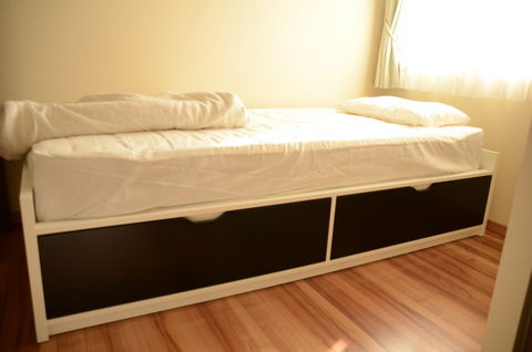 しかもこのFLAXAベッドは、大きな収納がついており、ベッド下に埃が入らないような造りになっているので、お掃除も簡単で、すっごく気に入りました。