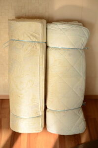 布団はくるくると丸めてひもで縛ると省スペースですね!