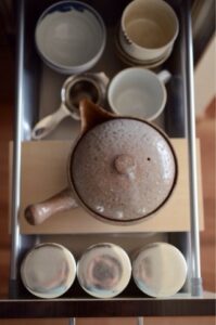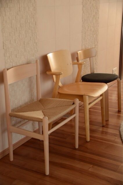 真ん中のは、フィンランドのイルマリ・タピオヴァーラ の「ドムス・チェア」、奥のは、同じくフィンランドのアルヴァー・アアルト の「Chair69」です。