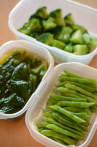 ブロッコリーはマヨネーズをかけてサラダに、つるむらさきは八方だしをかけてお浸しに、さやいんげんはごま和えにしたり煮物の青味にしたりして使います。