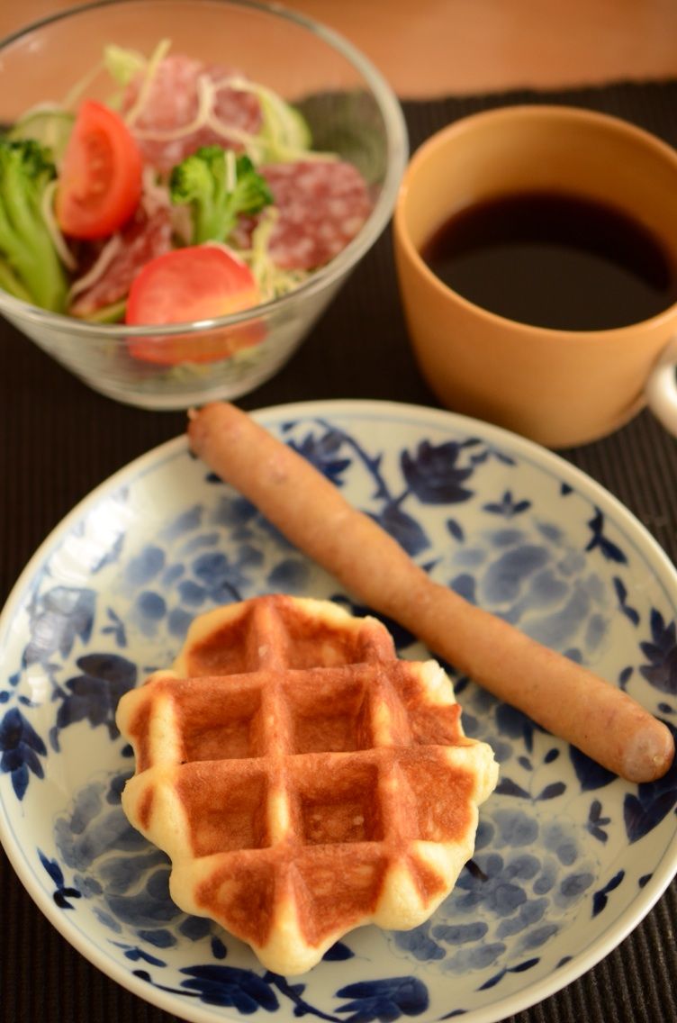 このワッフルは、ホイップバターを生地に混ぜ込み、薄力粉も入れるので、カリッふわっとした食感になります。