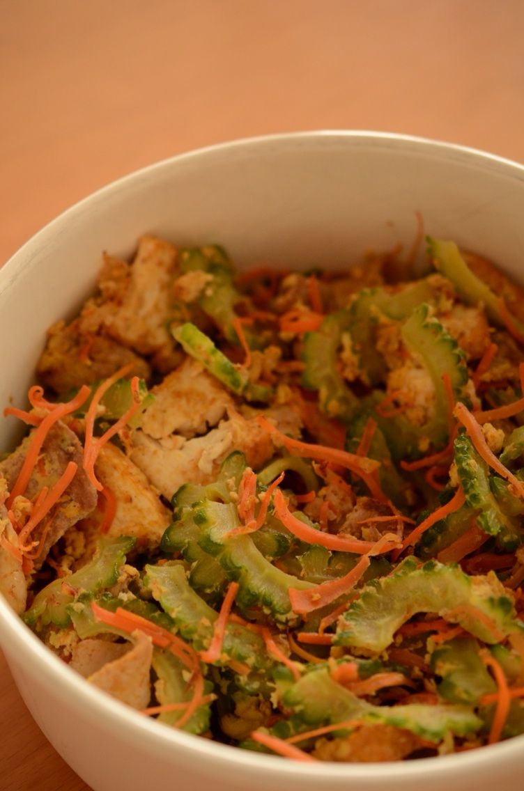ゴーヤーはスライスして厚揚げと人参と豚肉と炒め合わせて、ゴーヤーチャンプルーにしました。粉がつおを加えてしっかりと風味付けしました。