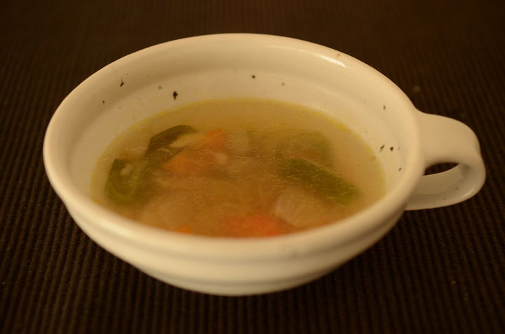 ミルポワと煮干しでだしを取りゲランド塩で味をつけただけのシンプルなスープ。
