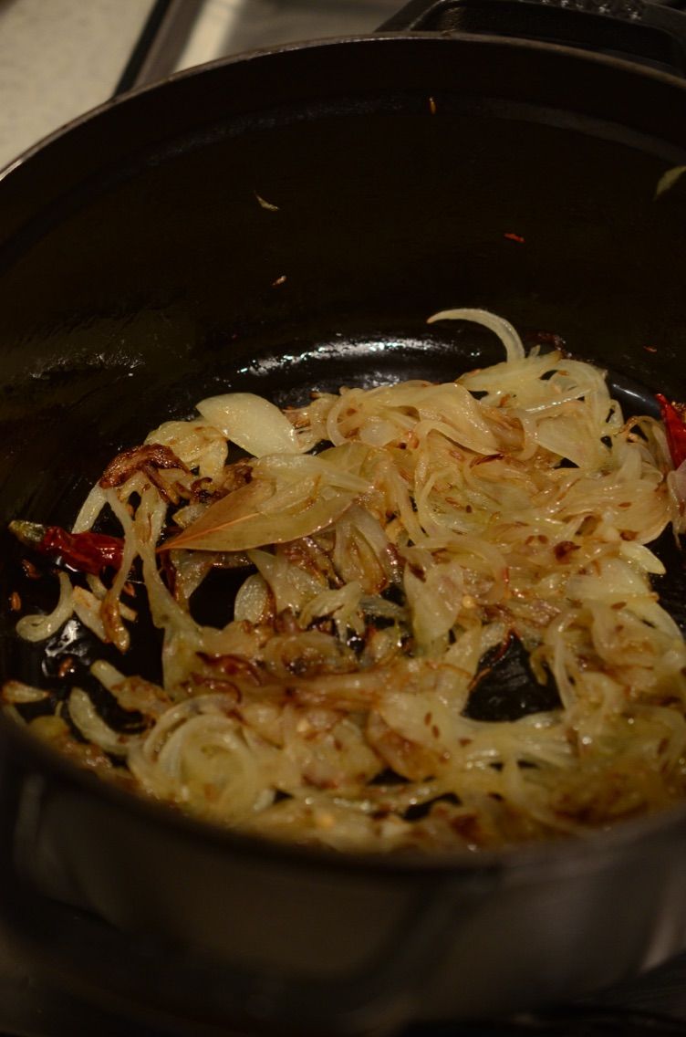 - 鍋にオリーブオイル、ローリエ、レッドペパー、クミンシード、玉ねぎを入れて最初は中火、後半は弱火で焦がさないように炒める(約10分、薄いきつね色になるまで)。