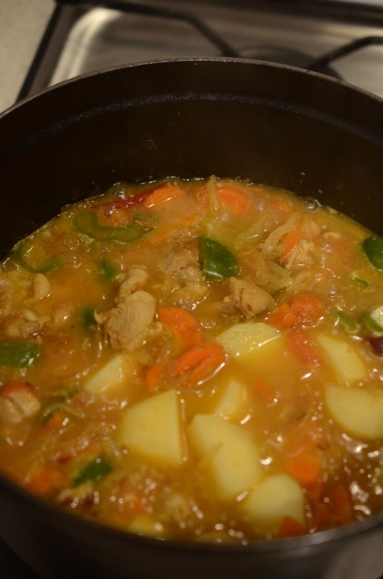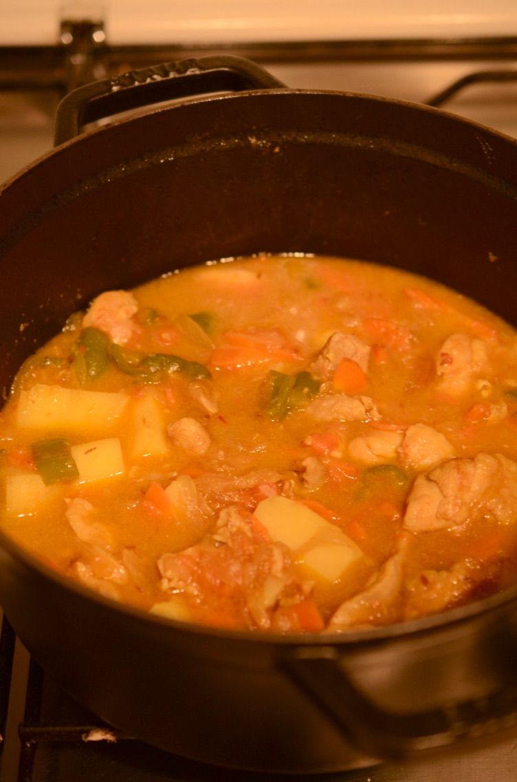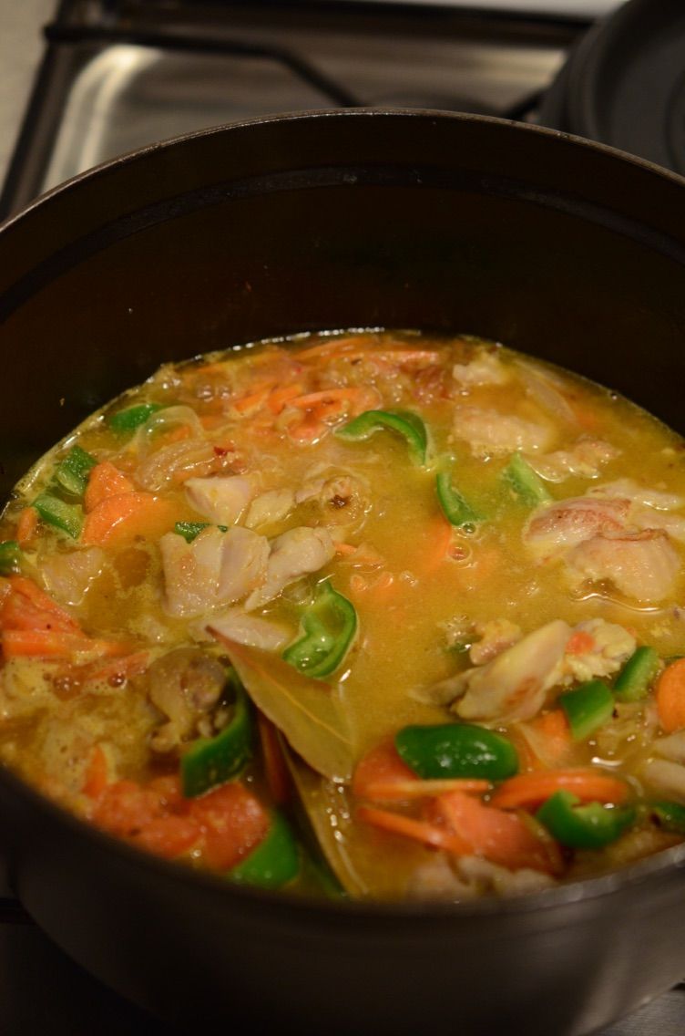 - 鶏もも肉を入れて肉の表面の色が変わるまで炒めたら、しょうが、トマト、にんじん、ピーマン、水、ターメリックを加えて煮込む(約5分)。