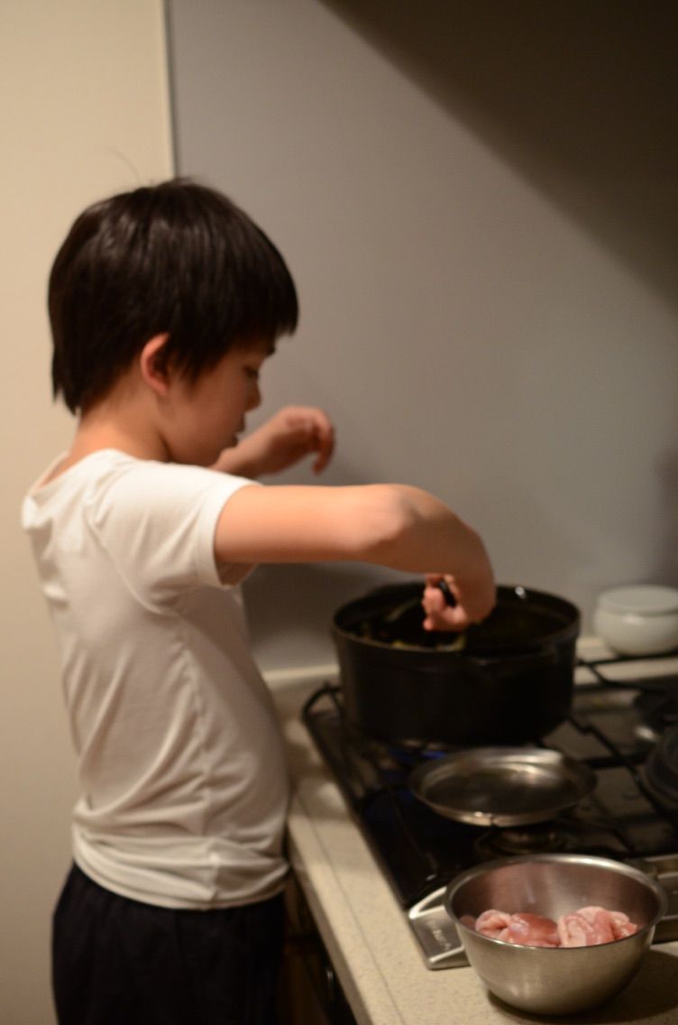 いざカレーを作ろうとしたら、息子が、「俺も手伝うよ。」と、脇鍋?を引き受けてくれました。ありがたかったです 笑。
