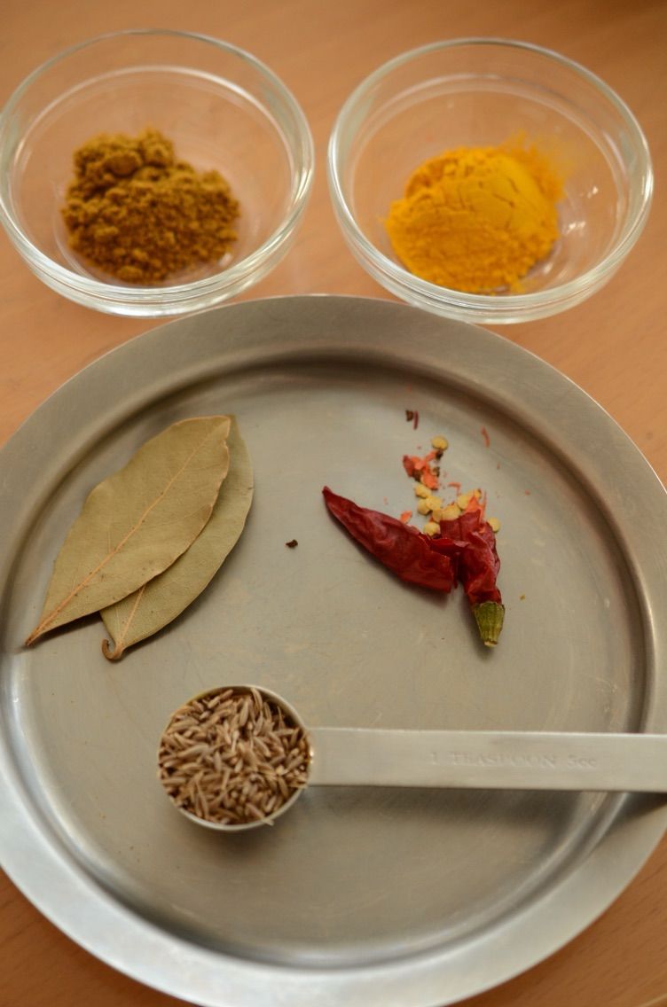 けれどスパイスを合わせるといっても何十種類も使ったりはしません!ほんの4種類、ローリエ、レッドペパー(赤唐辛子)、クミンシード、ターメリックだけ。(ガラムマサラはなくても全然OK)。インドカレーは実はすごくカンタンなのです。