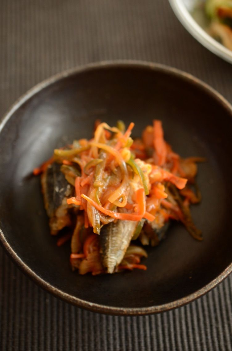 鯵を唐揚げにして、にんじん、ピーマン、玉ねぎを細切りにして甘酢あんを作ってかけました。