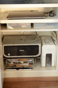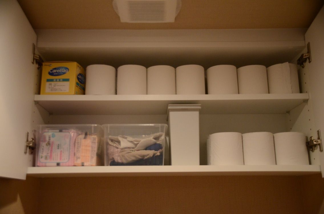 吊り戸棚には、トイレットペーパー、生理用品、ゴミ箱、あと、非常用トイレを置いています。