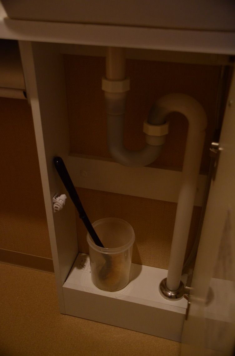 手洗いの下にはブラシをしまっています。長尺のブラシがスッキリとしまえるこの収納がすごく気に入っています。
