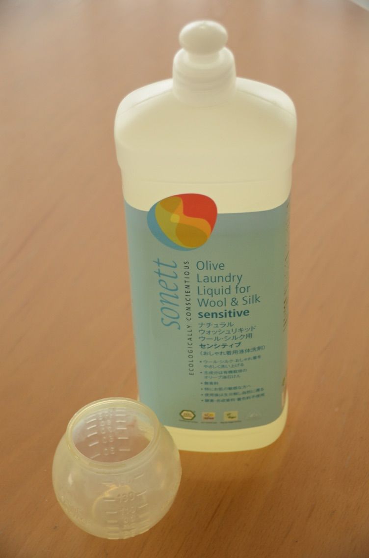 ドライクリーニング用の洗剤は、ソネットの「ナチュラルウォッシュリキッド ウール-シルク用 センシティブ」を使っています。主成分が石けんなのに、洗い上がりが安定しており、縮みなどの変化がほとんどありません。その上無香料ときてます。