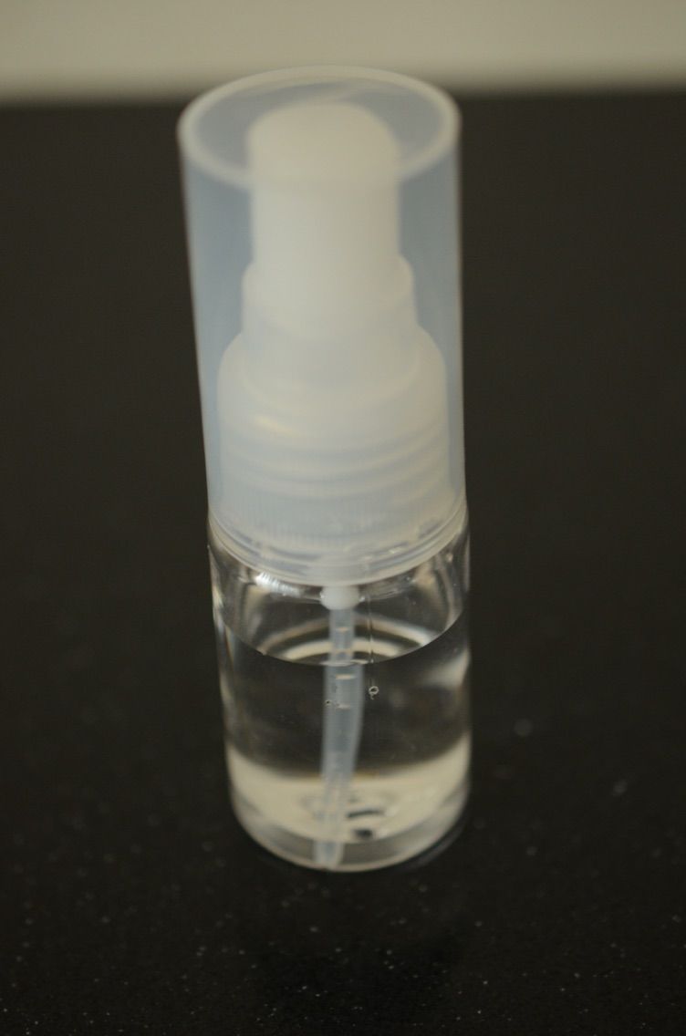 ただし、ビンを振って何滴か指に取る、というやり方はこぼしたりして少々やりにくいので、小さなスプレーボトルに入れ替えて腋の下に直接吹き付けることにしました。