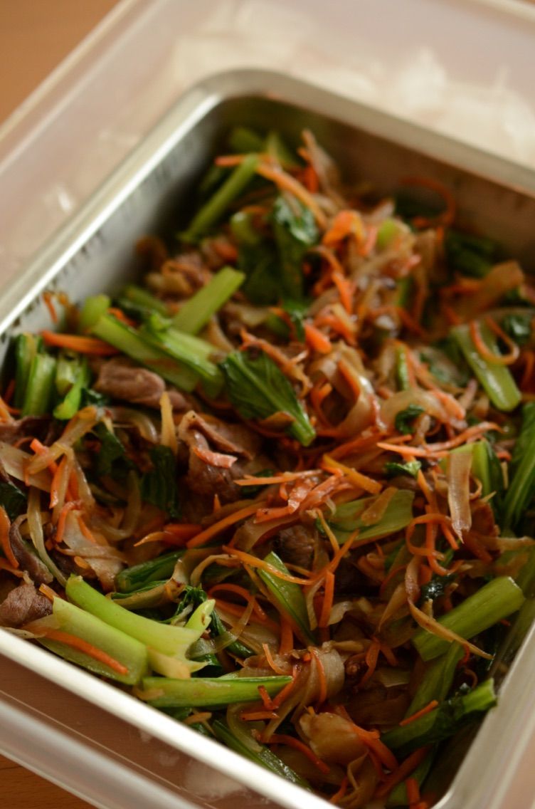 牛肉、にんじん、ごぼう、小松菜、玉ねぎ で肉野菜炒めを作りました。