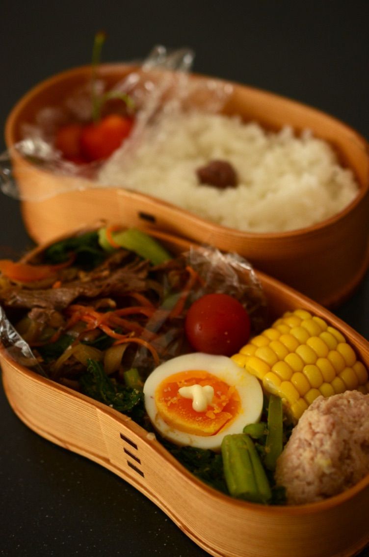 肉野菜炒め、半熟卵、とうもろこし、鶏つくね、小松菜おかか和え、ミニトマト、白御飯、自家製梅干し、さくらんぼ