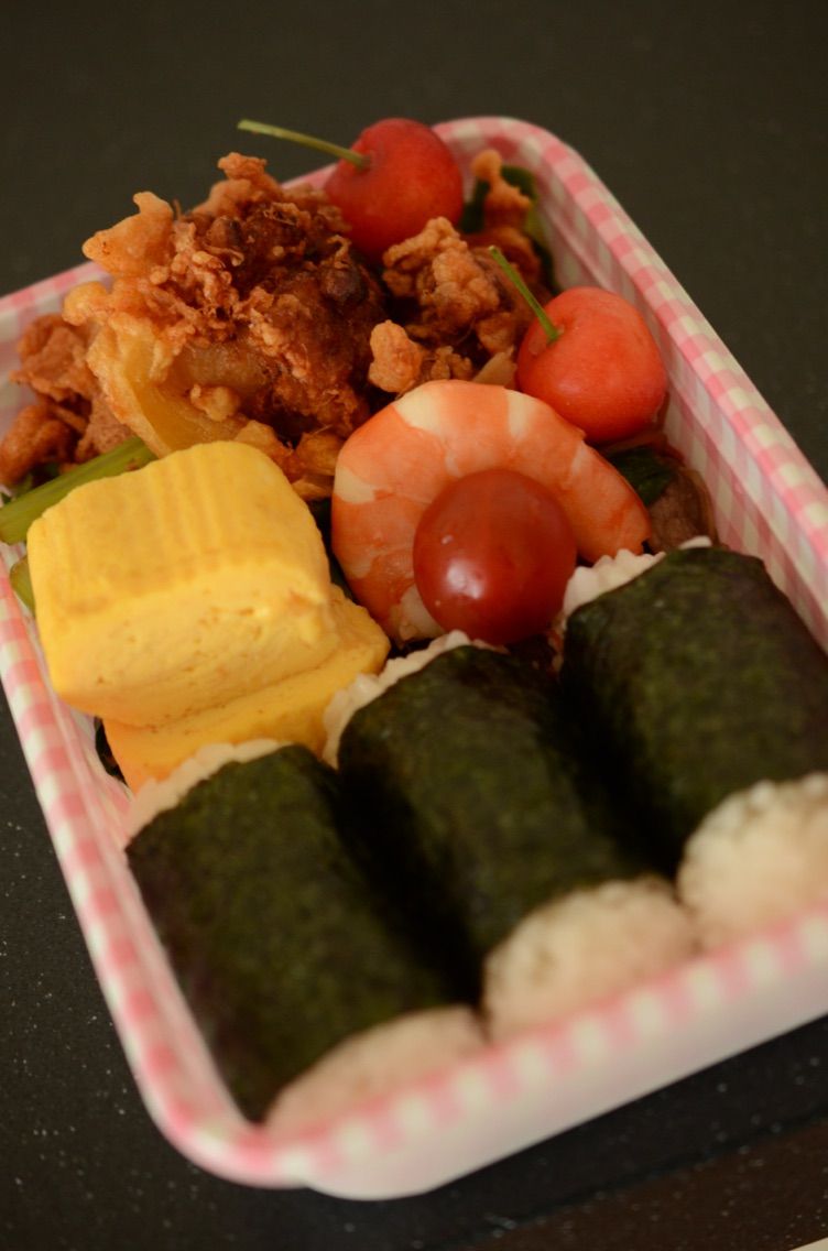 レタス、鶏唐揚げ、出汁巻き卵、海老芝煮、ミニトマト、小松菜、おにぎり、さくらんぼ