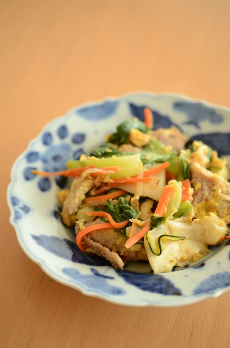 チンゲン菜、かぶの皮、人参、ズッキーニ、玉ねぎ、ぶなしめじ、豚肉 でいろいろ野菜チャンプルーを作りました。