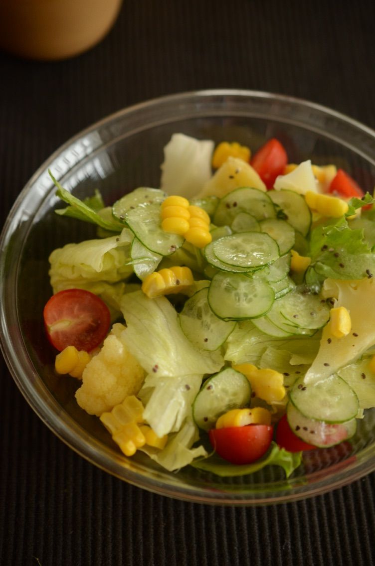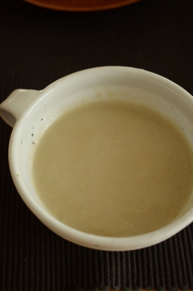 野菜ばかりの料理には、こうした亜麻仁油のドレッシングをたっぷりかけて栄養とカロリーを取るように気をつけてます。