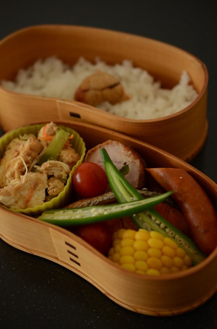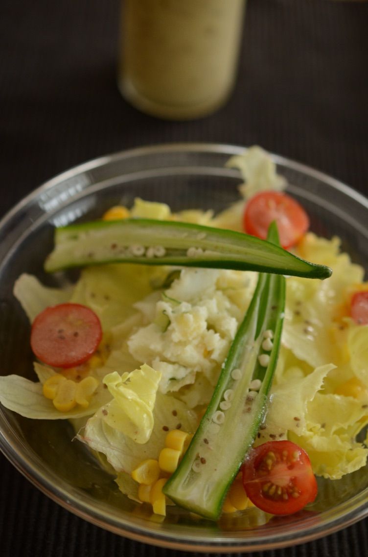 そして、このポテトサラダと、レタス、ミニトマト、とうもろこし、オクラでサラダを作りました。