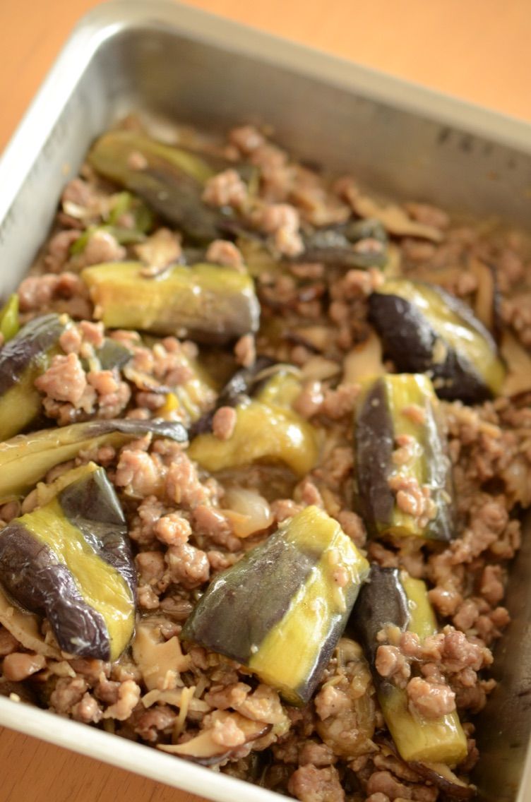 粗挽き肉、椎茸、なすで麻婆なすを作りました。味付けは豆板醤と帆立貝柱を戻し汁ごと。