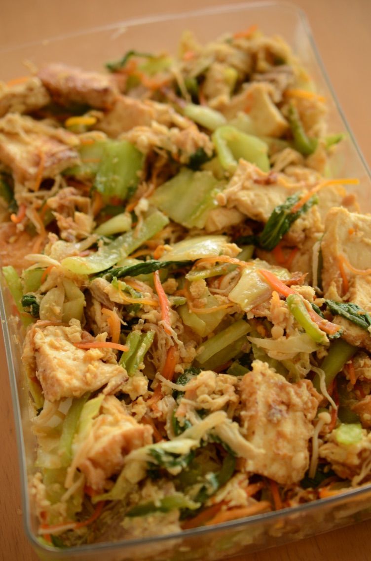 チンゲン菜、キャベツ、えのき、人参、ピーマン、豚肉、厚揚げ、卵、削り節でチャンプルーを作りました。