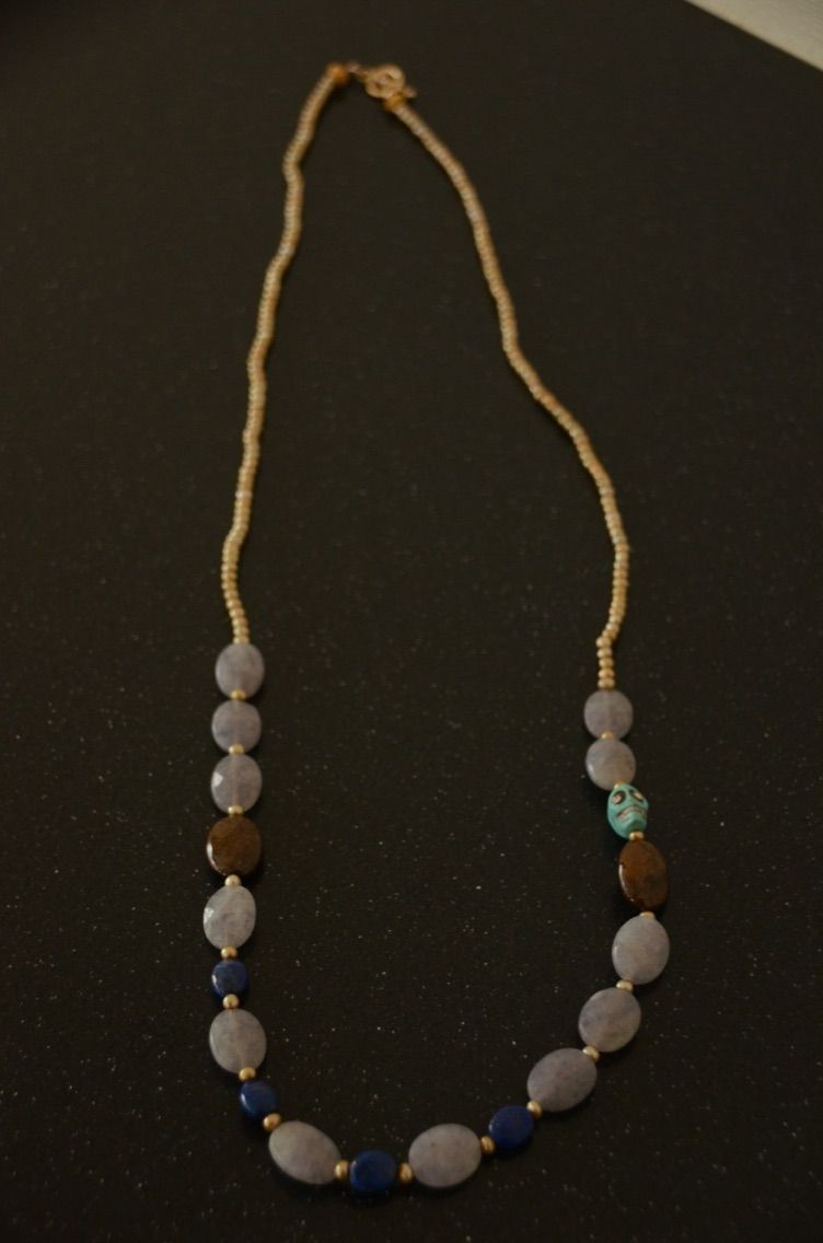 そして、前からやりたいと思ってた、ネックレスを自作しました。素材はこだわって、ゴールドフィルド、淡水パール、天然石 をふんだんに使って作りました。