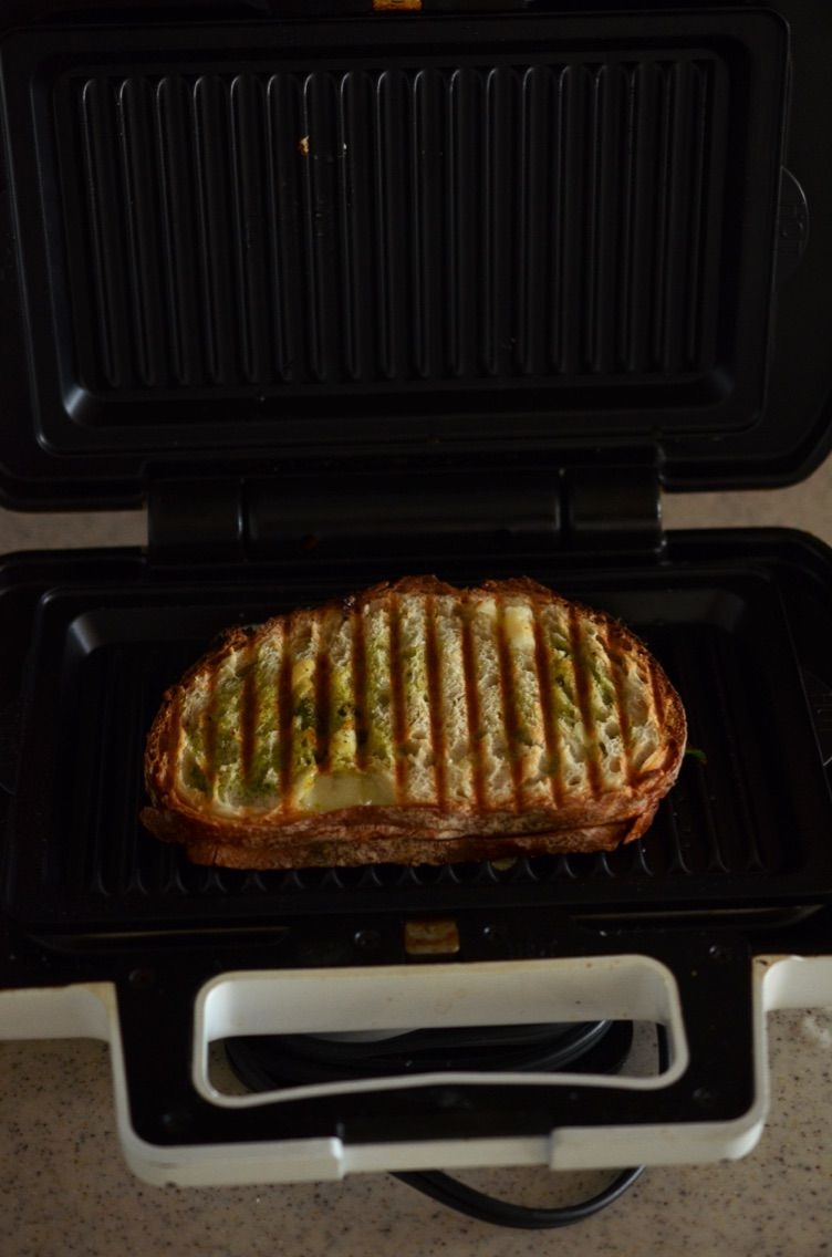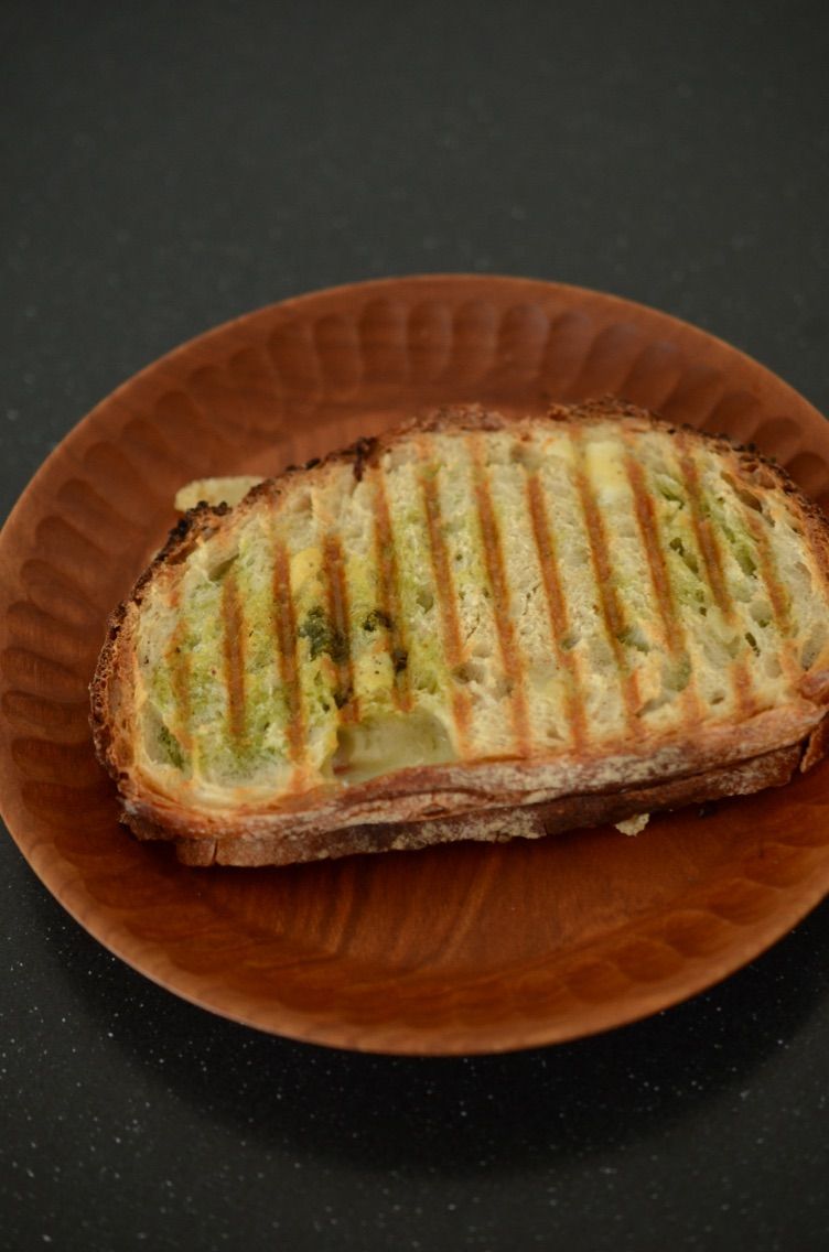 自家製カンパーニュを薄切りにしてバジルペーストを塗り、レタス、トマト、グリュイエールチーズをはさんで加熱しました。