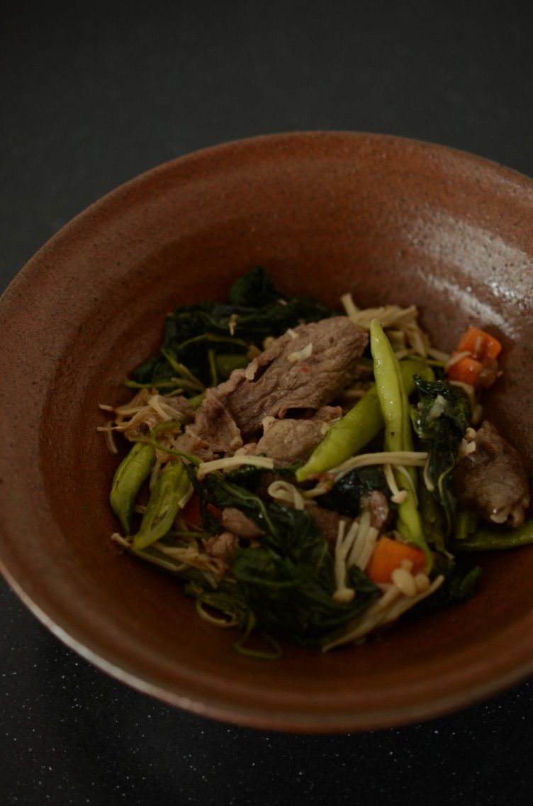 牛肉、モロヘイヤ、人参、いんげん、えのきで肉野菜炒めも作りました。
