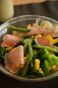レタス、トマト、とうもろこし、きゅうり、茹でほうれん草、いんげん、ブロッコリー、プロシュートでサラダを作りました。