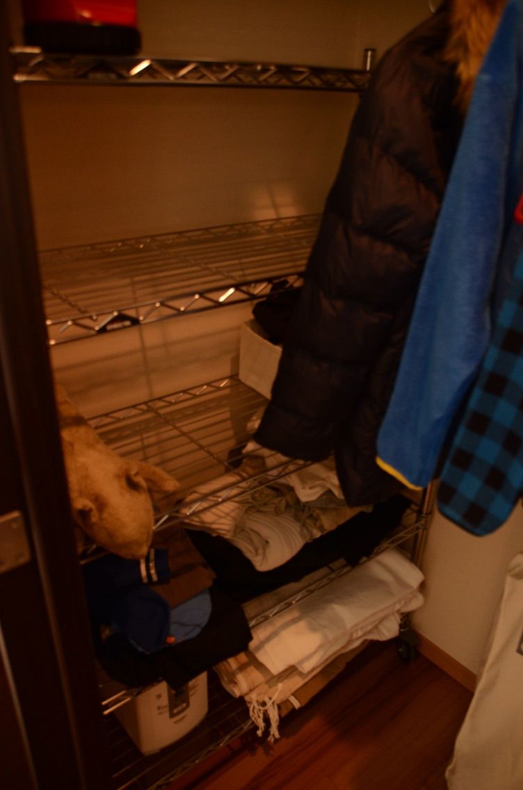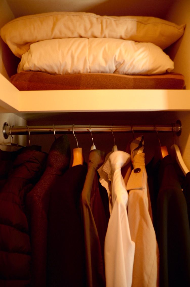 エレクターシェルフになんとなく積んでいた季節外の寝具も入り口入って右側の上部のスペースにまとめて置きました。洋服が減ったので、下部の比較的短いバーに自分のコート類は全て納まりました。
