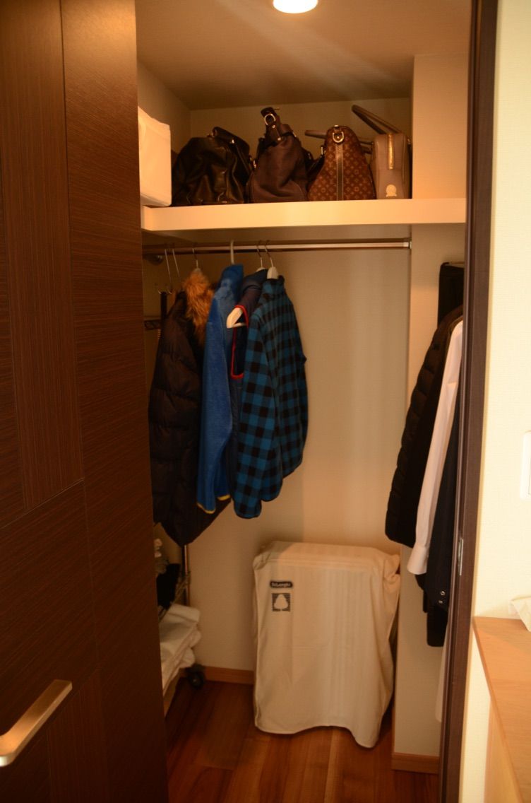 正面のバーは息子の上着だけでスカスカ、上にはバッグがゆったり整然と並べて入れられています。バッグはよく使っている物だけです。