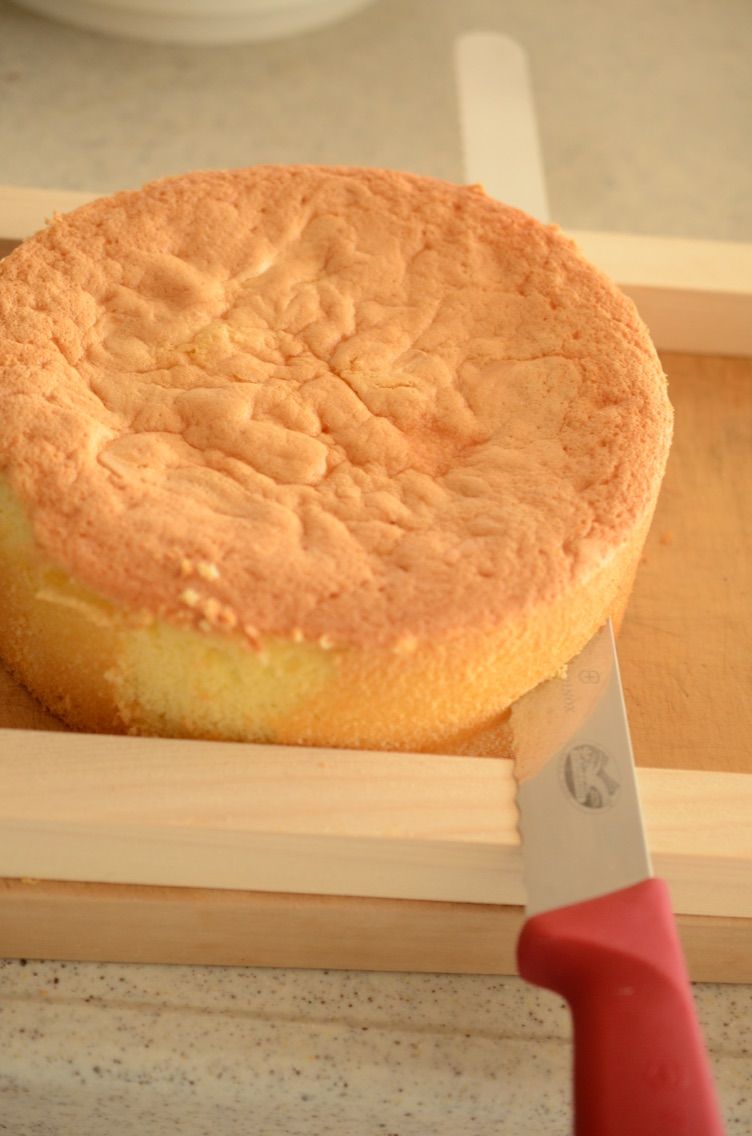 角材とケーキナイフを使って、スポンジをスライスします。ケーキナイフは「尺2」、刃渡り36cmもあります。