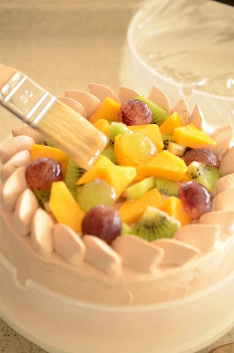 ぶどうは湯むきし、キウイとマンゴーはカットしてフルーツを並べ、ナパージュ(ゼラチン入りのシロップ)を刷毛で塗ってツヤを出します。