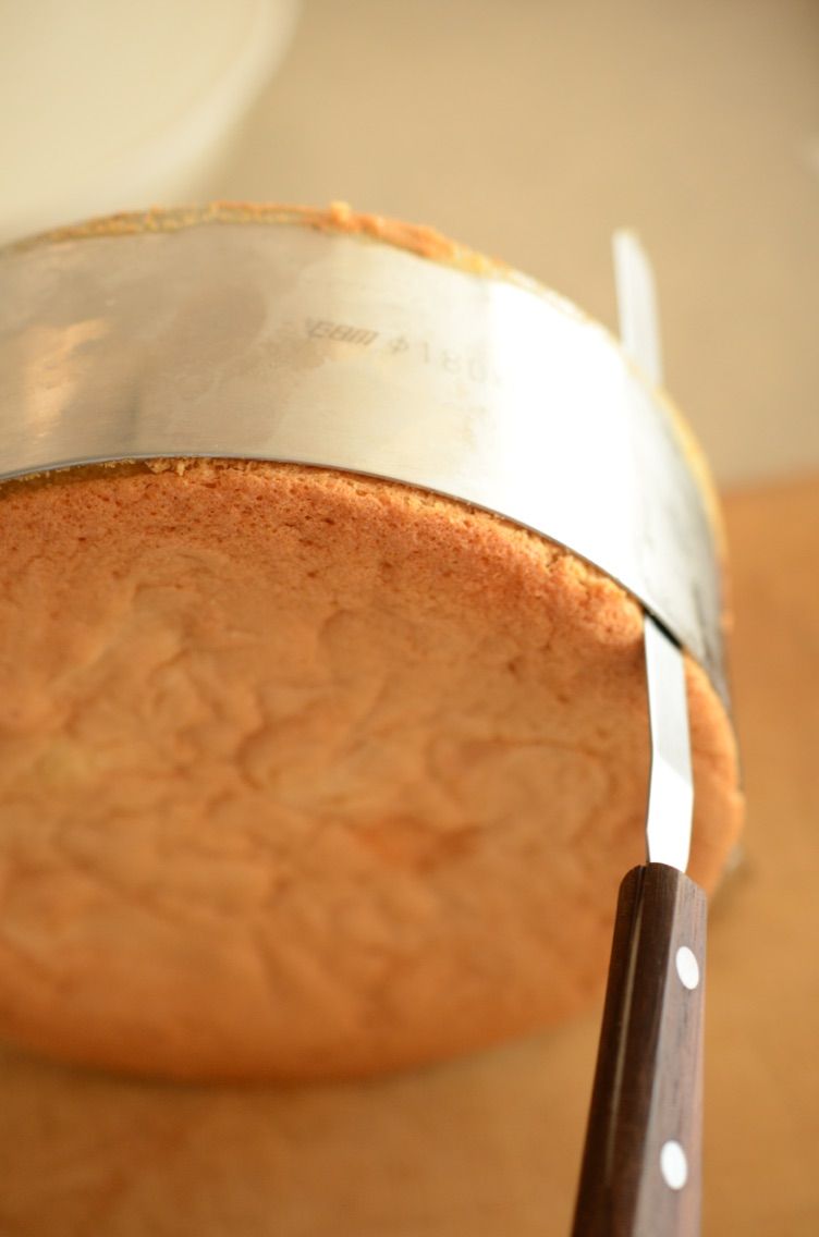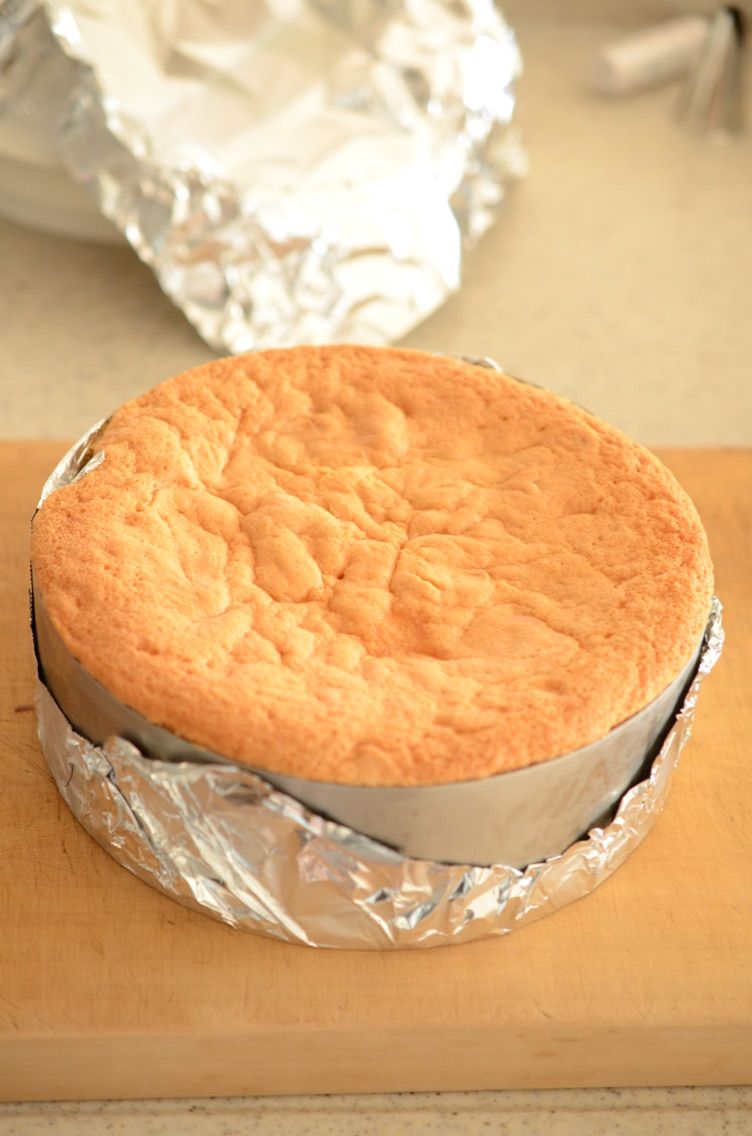 セルクル、アルミホイル、シフォンナイフを使えば、円筒形のきれいな形のスポンジが簡単に作れます。