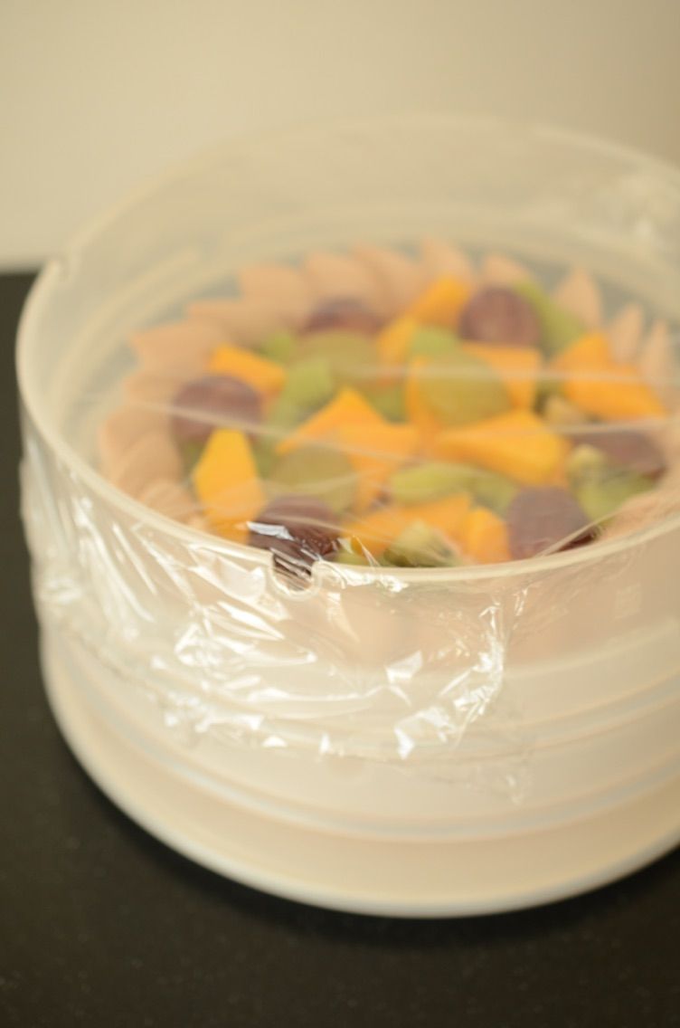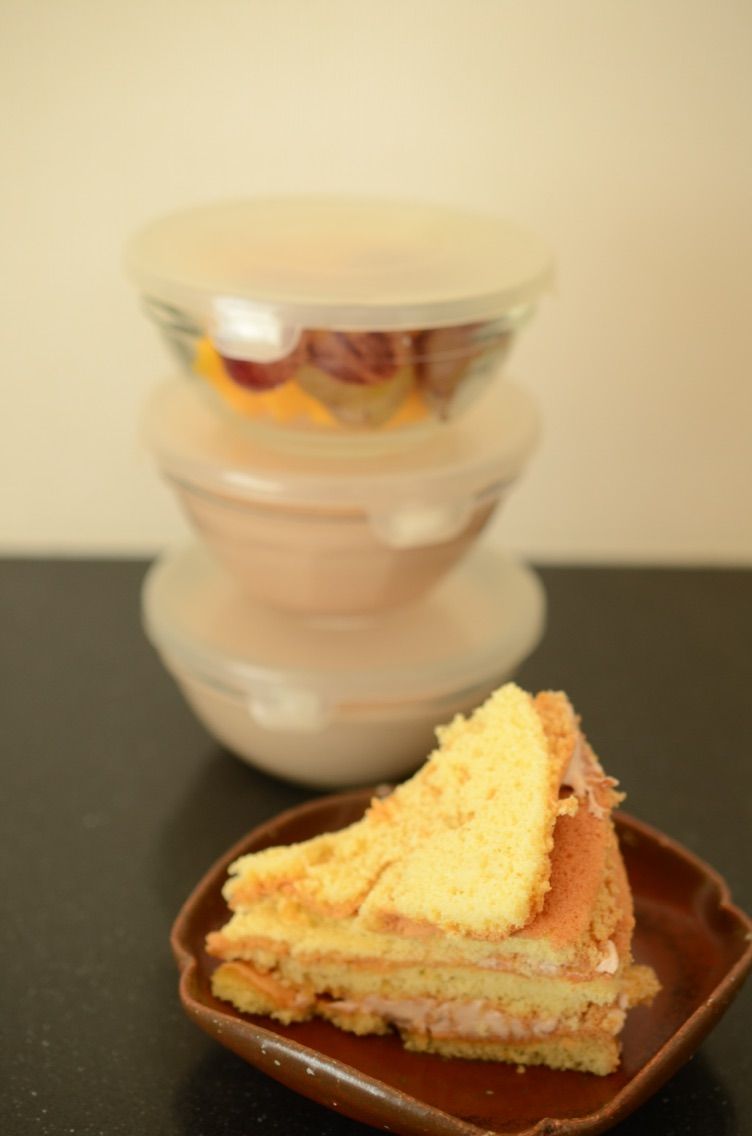 これを3個重ねて一番上にラップをかけてケーキにかぶせてしまってます。こうすると、冷蔵庫の棚を外さなくても、ホールケーキをコンパクトにしまえるのです。
