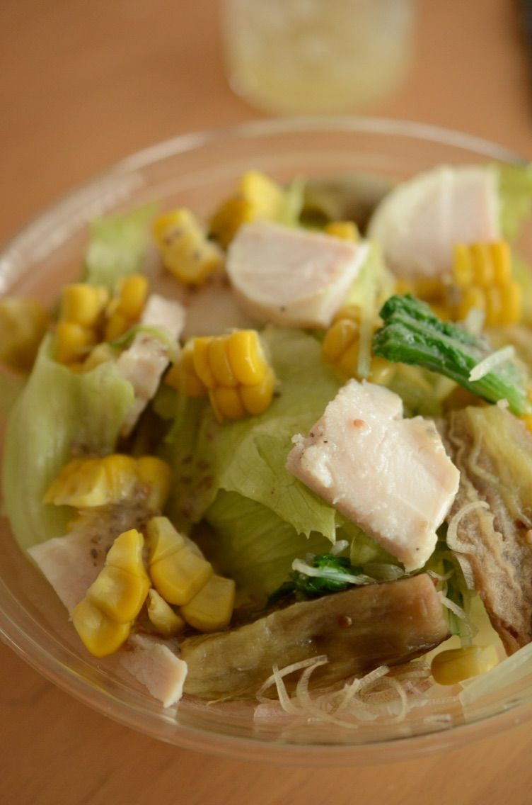 蒸しとうもろこし、焼きなす、水菜、みょうが、レタス、鶏ハム。