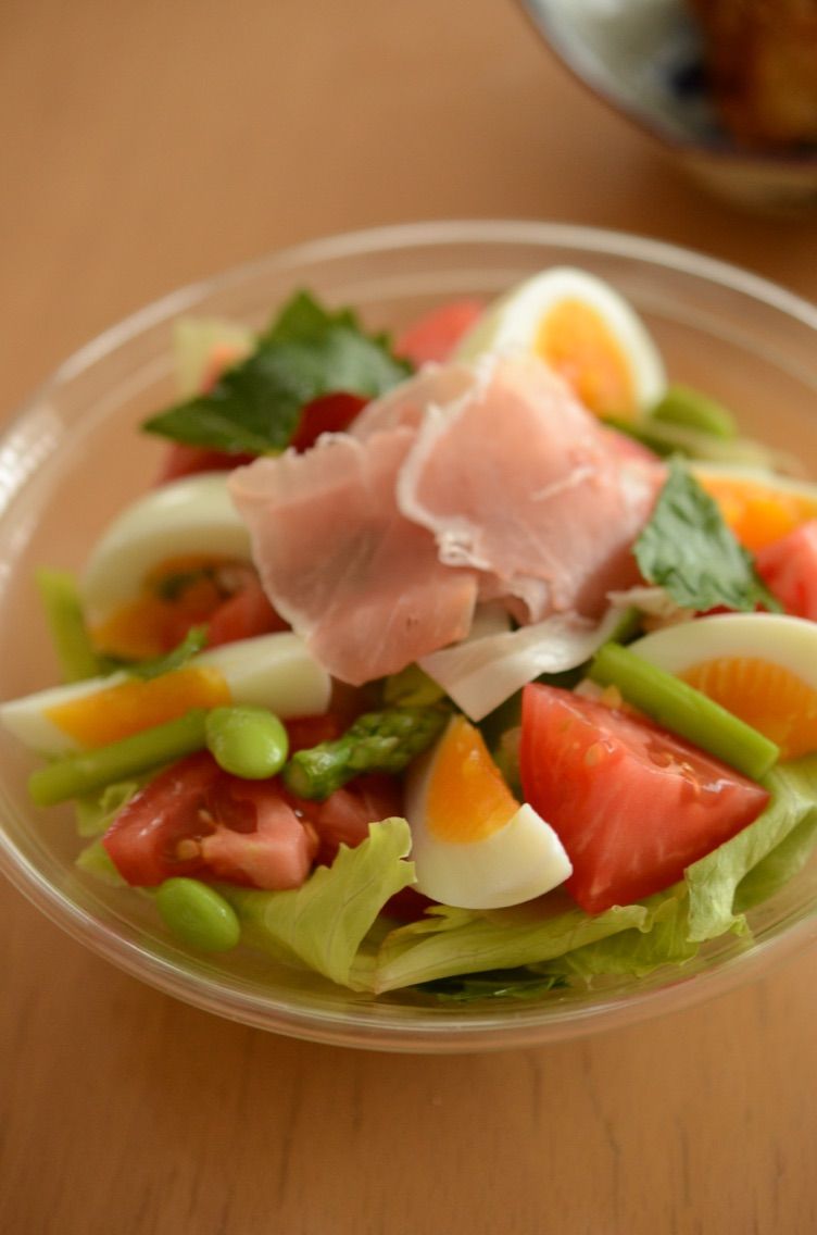 レタス、トマト、大葉、アスパラガス、枝豆、ゆで卵、プロシュート。