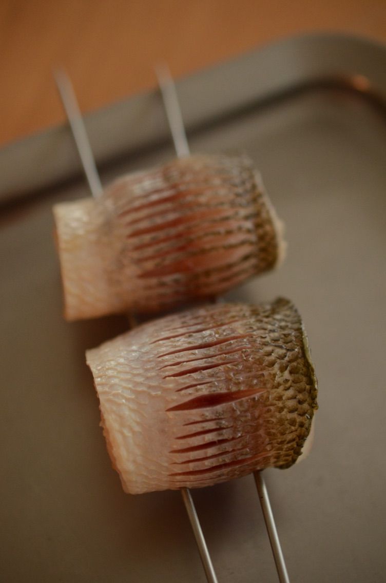 カマスのような薄長い身を焼くときは、くるりと丸めるような「片づま」に串打ちするとおいしくできあがります。